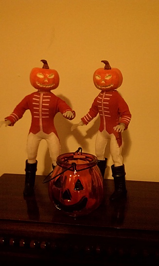 He's a requested creation from my fiance. I found a small foam pumpkin at an art store and carved a jack o lantern, stuck a neck plug on and made a mold. His eyes and suit glow in the dark - I was pretty surprised by how cool it looks glowing in the dark.