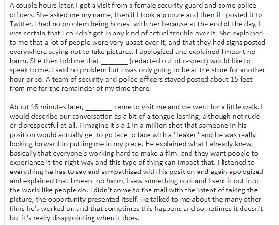 ^I can't really blame the production folks getting bent out of shape about this. Unofficial pictures can really sink a production. On the other hand, when they decided to film in a public mall, they should have known what was going to happen, and officially leaked a nice, photoshopped photograph of Levi in the suit first.