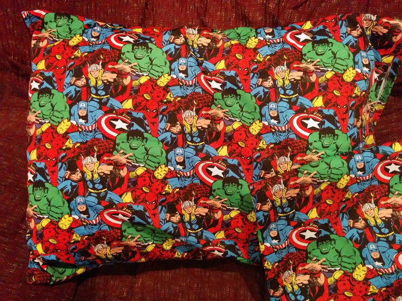 My wonderful wife has been sewing non-stop for 5 days making over 90 suits. She managed to make these Marvel pillow cases for me to sell at MM. They fit a standard size pillow. Price will be $10 a case (less if you want a pair).