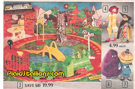 My sister had Grimace ( basically a hairy beanbag with feet, LOL) and I do recall seeing thesee new in stores and really was impressed with that playset. Never had any of the others or the set, though. I wouldn't mind the Hamburger headed ones and maybe a nice Ronald and Hamburgler but the others are kinda MEH.