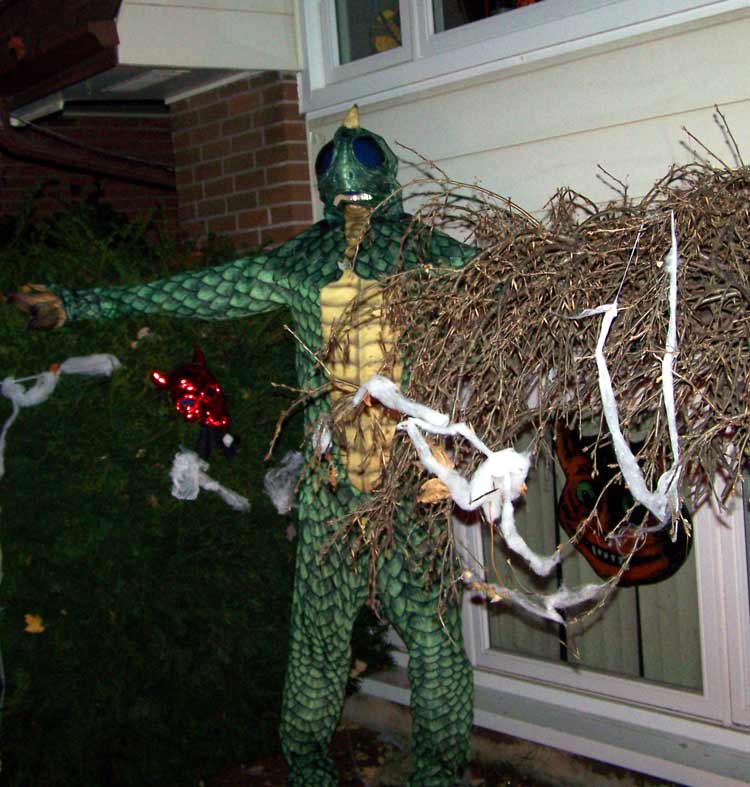 I planned on doing this earlier but happily this was the most kids I've ever had to the casa. I was beginning to worry that Halloween was in trouble but I'm glad to be wrong. Above is my Sleestak, built mostly with trash. Most people called it the Creature from the Black Lagoon, I'll live with that.