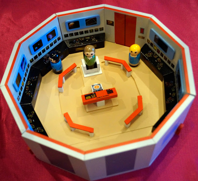 The set itself is wood (just like the real Star Trek Bridge set!) and comes in two pieces, the view screen area is detachable to add play value.