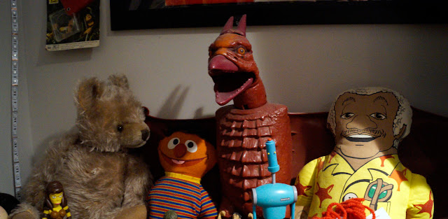 And here he is, my 3rd Rodan toy hanging with some of my childhood toys, hung over my workspace, he's often one of the first things I see every day (after my dog). He never fails to bring me joy.