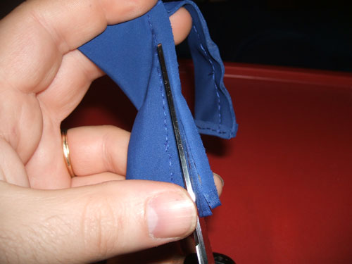 When finished, turn them back inside out and carefully cut away any excess material along the waist hem. Just like the other seams, make sure you don't get too close to the thread. Leave about 1/8" of material between the edge and the thread.
