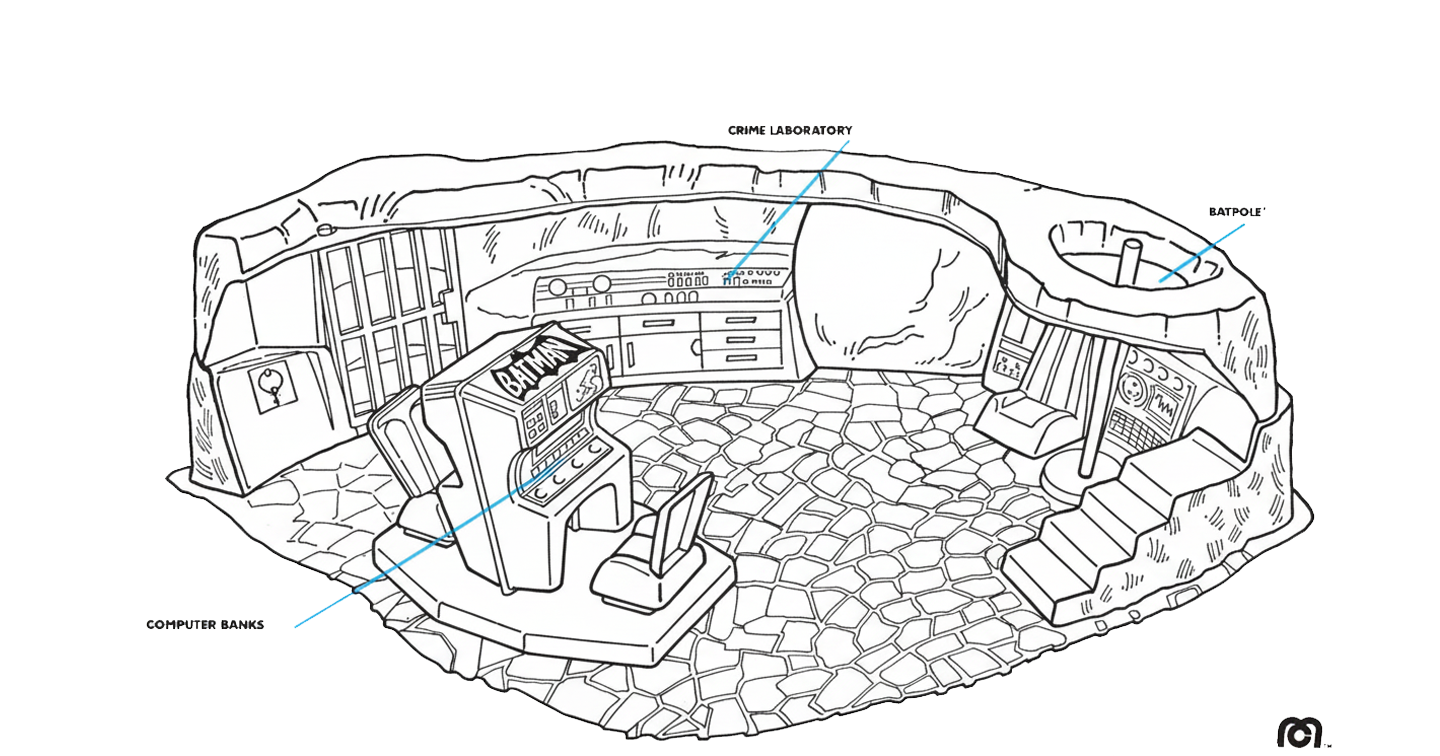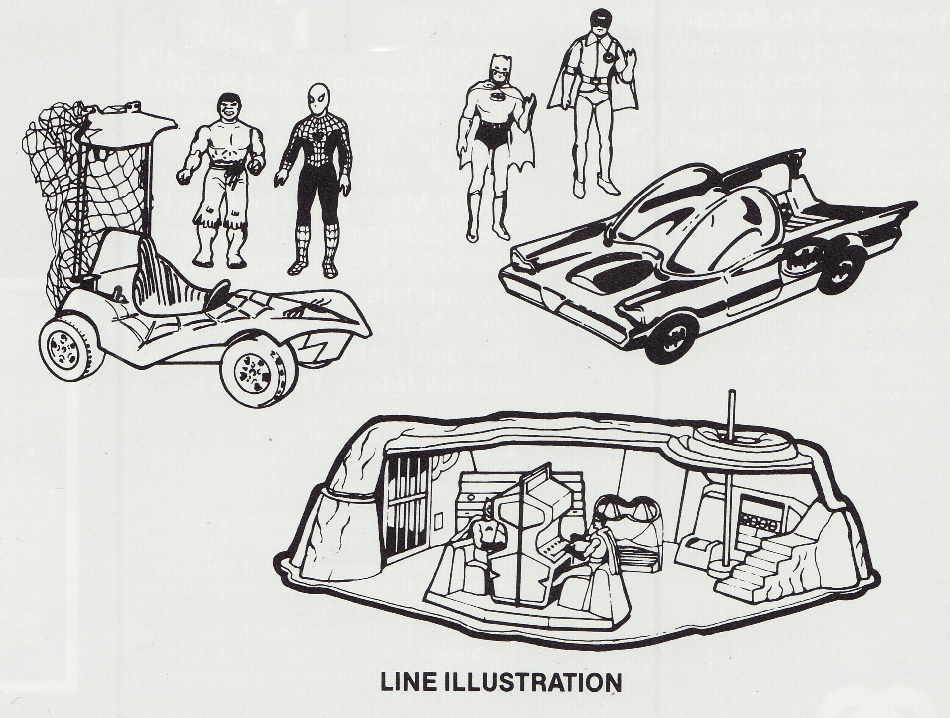 Batcave sell sheet line art from the Mego 1981 Catalog. Note that the figures are clearly drawn as the 8″ WGSH characters in this ad.