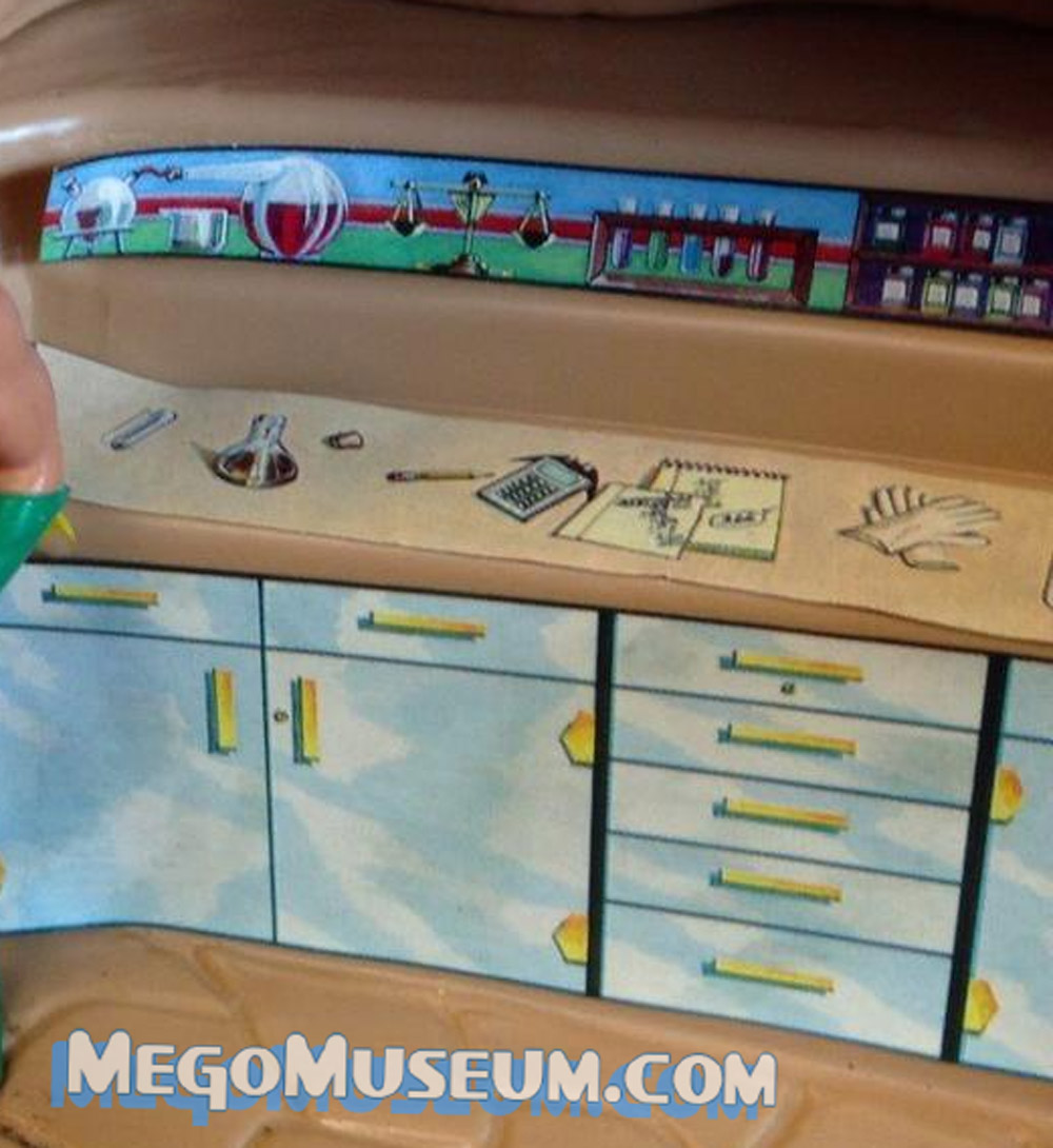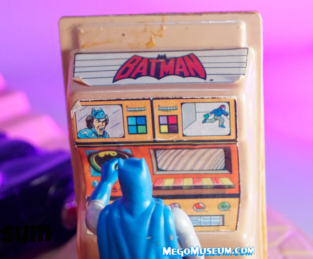 Boxed Mego Batcave from looks very similar to the Star Trek Enterprise and Buck Rogers Command Center produced that same year; vinyl over cardboard had given way to cheap vacuform. Careful inspection will show Lex Luthor, not the rightful Joker, in the detention cell. The Joker was touted on the red cards, but sadly, never made it to the line.