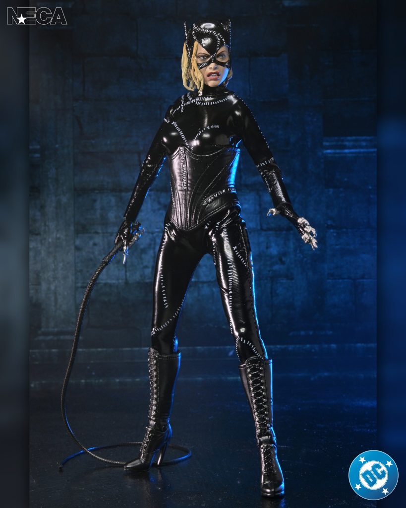 NECA presents this clothed action figure of Catwoman from Batman Returns, featuring the authorized likeness of Michelle Pfeiffer, whose unforgettable performance in the 1992 Tim Burton film still defines the character. Selina Kyle, the repressed and belittled secretary of corrupt industrialist Max Shreck, leads an uneventful, ordinary life. That is, until he tries to kill her after she discovers his sinister secret to siphon off power from the Gotham electrical grid, giving Shreck full control of energy for Gotham City. After surviving the fall and being awakened by alley cats, she unleashes her true, fierce nature and is re-birthed as Catwoman. She allies herself with The Penguin to exact revenge against Shreck and the Batman, who is trying to foil their criminal master plans. This 8-inch scale Catwoman figure wears tailored soft goods clothing inspired by vintage toy lines. Accessories include her whip, taser, interchangeable hands, and an alternate, battle-damaged final fight head. Comes in window box packaging with slipcover.