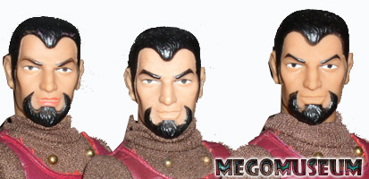 The Klingon figure went through three distinct face incarnations. The first was a Type 1 head (lighter flesh) with dark-pink detailing on the lips (left). The next was a Type 1 head (lighter flesh) without lip paint (center). The third and final head was a Type 2 head (darker flesh) without lip detailing. The first is certainly the rarest, while the third is, by a sizeable margin, the most common.