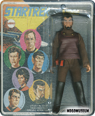 the Klingon (Item No. 51200/7), a lone warrior representing the race that poses the single greatest threat to the Federation. The head sculpt on this figure bears more than a passing resemblance to Captain Koloth (portrayed by William Campbell) from the classic episode "The Trouble with Tribbles," and it is widely accepted that this is, in fact, the inspiration for the face. The uniform, however, seems to have been modeled after the Klingons as featured in the animated series.